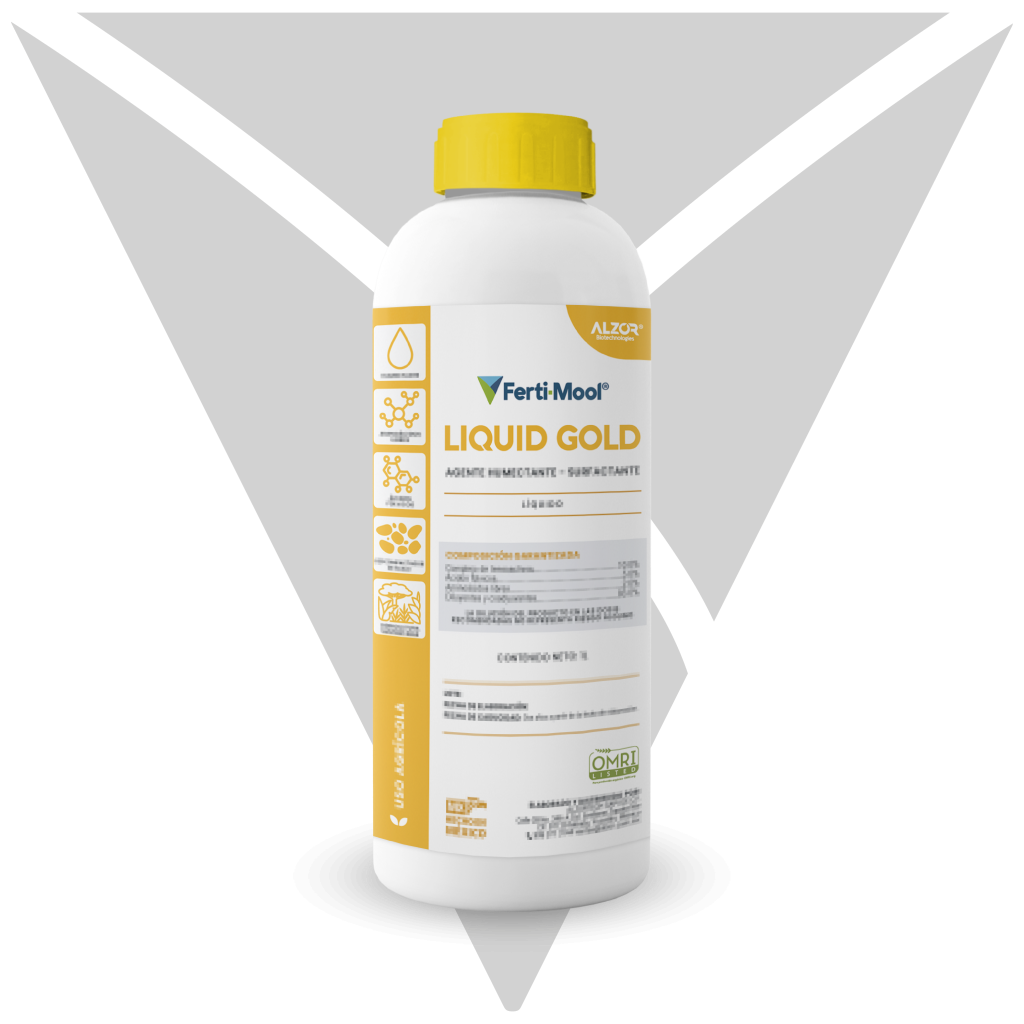 Ferti-Mool LIQUID GOLD es un agente humectante a base de Complejo de tensoactivos y aminoácidos como biosurfactantes, los cuales rompen la tensión superficial del suelo para mejorar la infiltración del agua y reducir la compactación. Los ácidos fúlvicos y aminoácidos como el ácido glutámico promueven un mejor crecimiento radicular, así como una mejor hidratación y nutrición de la planta. Se incrementa la aireación y el desarrollo de microorganismos benéficos. Desbloquea nutrientes como el fósforo y potasio presentes en el suelo.